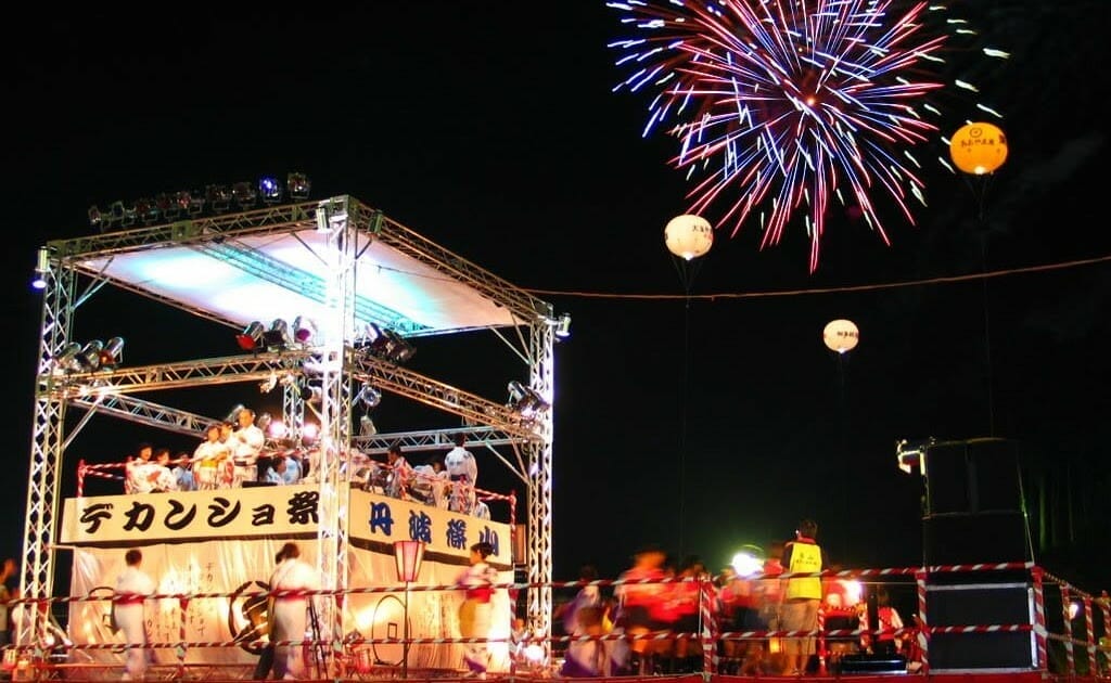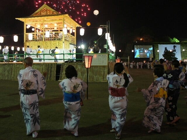 除了供奉祖先,日本的盂兰盆节肯定是少不了夏日祭的。篠山夏日祭是DEKANSHO祭,在日本关西地区也是非常有名的,还入选了日本遗产。在夏日祭上,篠山一直都会在篠山城下设置主会场,周边会摆出很多摊位。有吃的,喝的,玩的,其中最受大家欢迎的就属炸鸡块,刨冰,捞金鱼了。大家穿着浴衣参加节日活动。夏日祭给人印象最深的就是大家围绕着会场中心的舞台跳盆踊。盆踊象征着被免去苦难的亡魂们在地下欢呼庆祝的模样。不过现在已成为大家互相亲睦,欢聚的活动了。盆踊开始时舞台中心弹唱起属于各地自己的盂兰盆节民谣。不管是男女老少大家都会自发走入盆踊的队伍中去,随着民谣起舞。大家围着中心舞台,环成一个圈,由外围逐渐绕向中心,再由舞台回到外围,每个人都能成为舞台的中心。