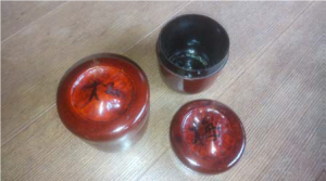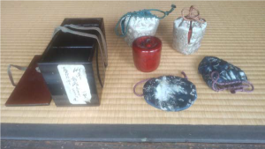 The lacquered tea caddies mentioned above are a matched set, but with different Kanji characters written on them. One has the character for plum (梅) for use in late winter, just before the plum trees bloom, and the other has the character for pine tree (松) for use any time of the year (because pine trees are traditionally considered to be sacred and are used as symbols for celebrations).
