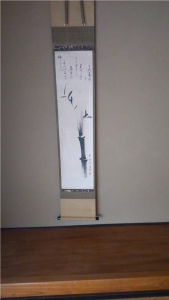 And saving the best for last, this drawing of plum blossoms in the moonlight was painted by Chikka-san. The calligraphy was written by the tenth head of the Yabunouchi school of tea (which I practice and teach). Yabunouchi previously had a branch in Sasayama when the tea ceremony was much more popular, and I’ve been shown records of past tea ceremonies held by Yabunouchi in Sasayama. Obviously Yabunouchi tea people mingled with the famous painters of the time. The calligraphy reads, “A garden, plum flowers lit by a cloudy moon.”