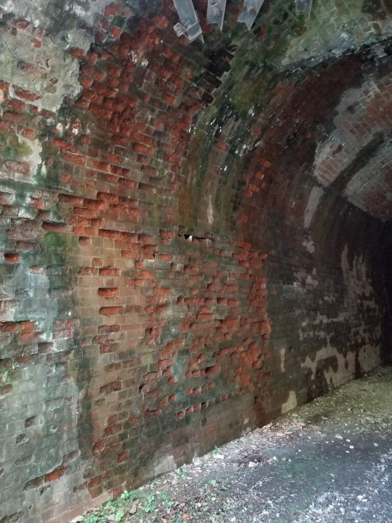 Going through a white gate at the junction of R138 and the tunnel road, then hiking uphill from there is an approx. 300m walk up the old original road that leads to the entrance of the first tunnel(a.k.a. Meiji tunnel). This tunnel was built in 1883, it is 3m wide and 268m long. Approximately 280,000 bricks were used in its construction. It cost 40,000yen to build back then. It is the oldest brick stacking style tunnel in Japan and 5th oldest existing road tunnel in Japan.