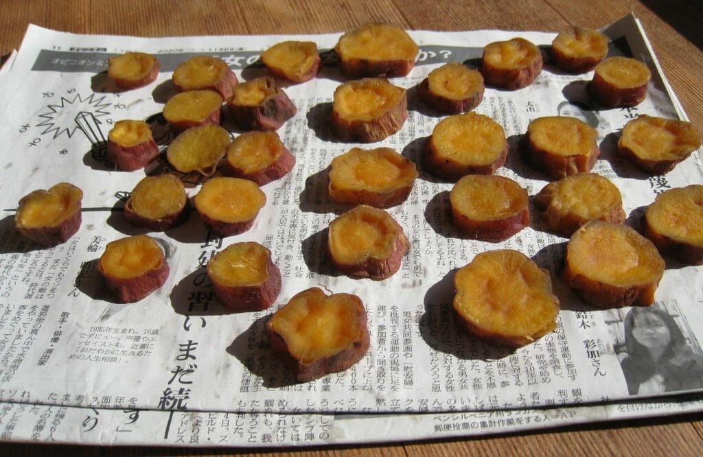 You might be surprised at how many types of sweet potatoes are raised in Japan. Every year we raise between three and five varieties, from yellow to purple to cream colored, and there are many more. The photo shows the smaller ones from our crop this year, which my wife slices and stews in sugar before drying them to a chewy consistency. We then throw them into the freezer and have them with matcha throughout the year. My wife also roasts them in their skins for breakfast much of the year.