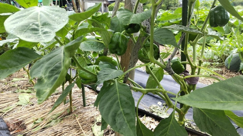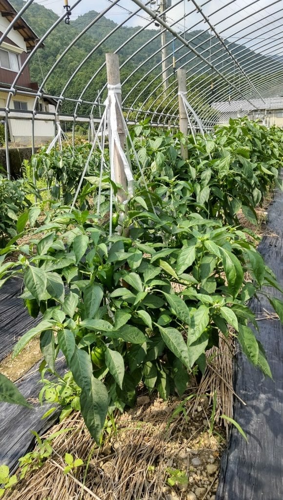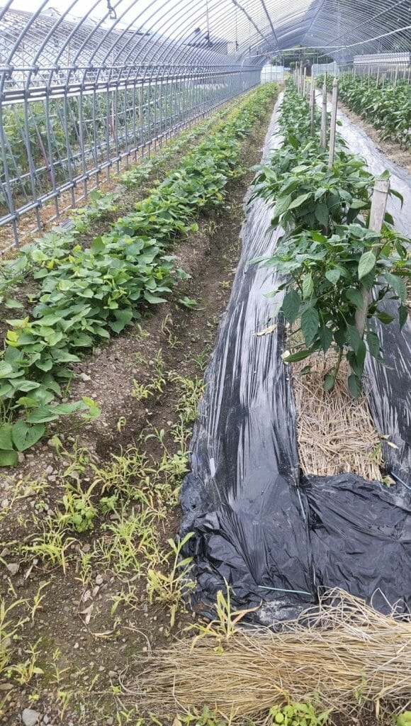 Bell peppers are handled the same way as most other corps, i.e., in high rows, but with peppers, they generally use regular plastic sheets rather than woven ones because peppers require less water. (The braided sheets let a lot of the water pass through into the soil.) The same “three branches from the main stem” rule applies here too. The big difference is that the peppers get very heavy as they mature and they produce a lot of fruit that takes time to mature, so supports are introduced along the rows and the branches of the pepper plants are strung up with plastic cords to support them.
