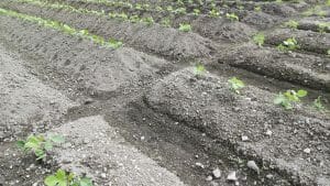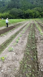 In some ways, Kuromame are even more work than Yama no Imo. First the seedlings are planted in the rich loose soil of the seed beds and rows are prepared. When the seedlings are big enough, they are transplanted into the rows one seedling at a time. This is necessary to keep the birds from eating the young seedlings when they first come up. (You can easily protect the seed bed but not the entire garden.)
