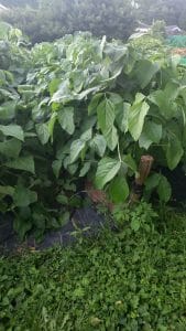 For the most part, these are raised in the same way as bell peppers except for one thing. The leaves of the eggplant age quickly and get eaten by insects, but new leaves come out quickly on healthy plants. As long as you keep the plants well watered and fertilized (but only a little at a time), the only problem with the old leaves is that they block the sunlight and airflow. My farmer friend says the general rule is to cut off two old leaves for every eggplant you harvest, but she admitted that she cuts off a lot more than that, though you cannot tell so by looking at her luscious green plants. Again, she harvests eggplant every morning for the market, and I’ve heard rumors that all of her produce sells first and that she often has to take more later in the day. Obviously all that hard work pays off.
