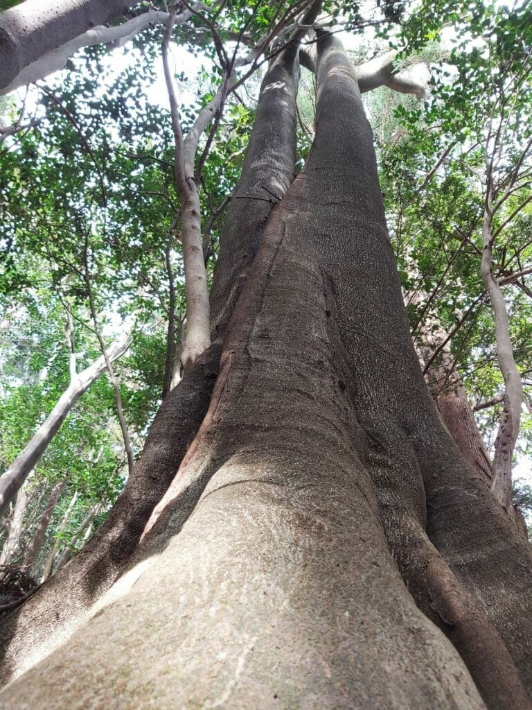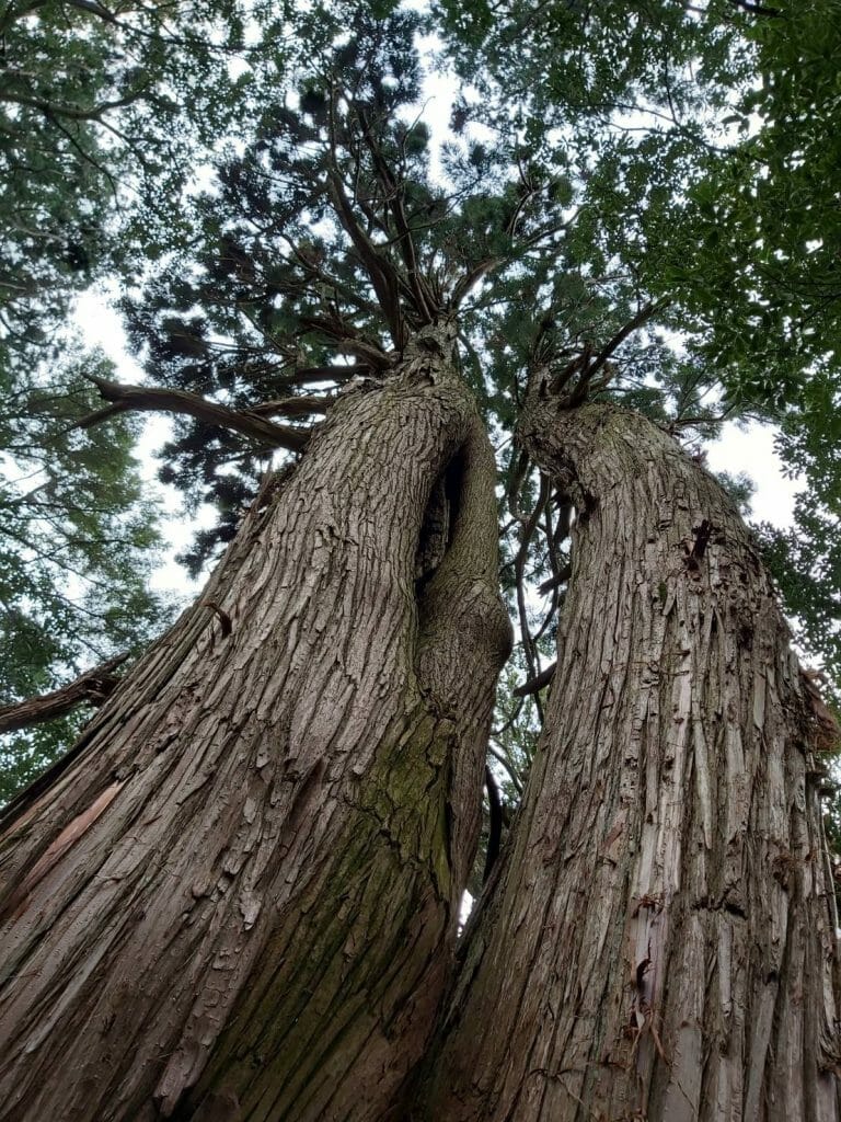 If you climb up to Matsuosan, which you’ll see the site of an old mountain fort, and then keep going for a ways down the other side (which is not the main way to Shiragamidake), you will find a secluded area that was inaccessible to logging, which served to preserve the older trees. The Japanese collectively call these “1,000-year cedar” to mean that they are very old. (It is not an estimate of their actual age.) Below is a photo of the main one, which splits into two trunks just above the ground level. There are also some other very old Japanese cedar in the same area.