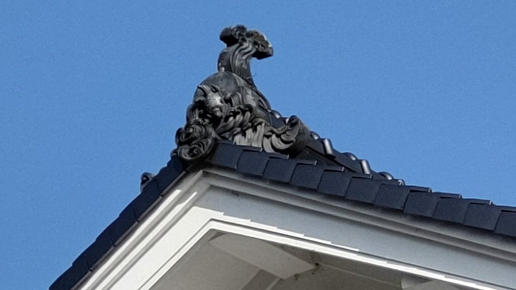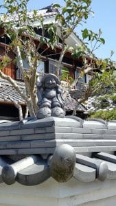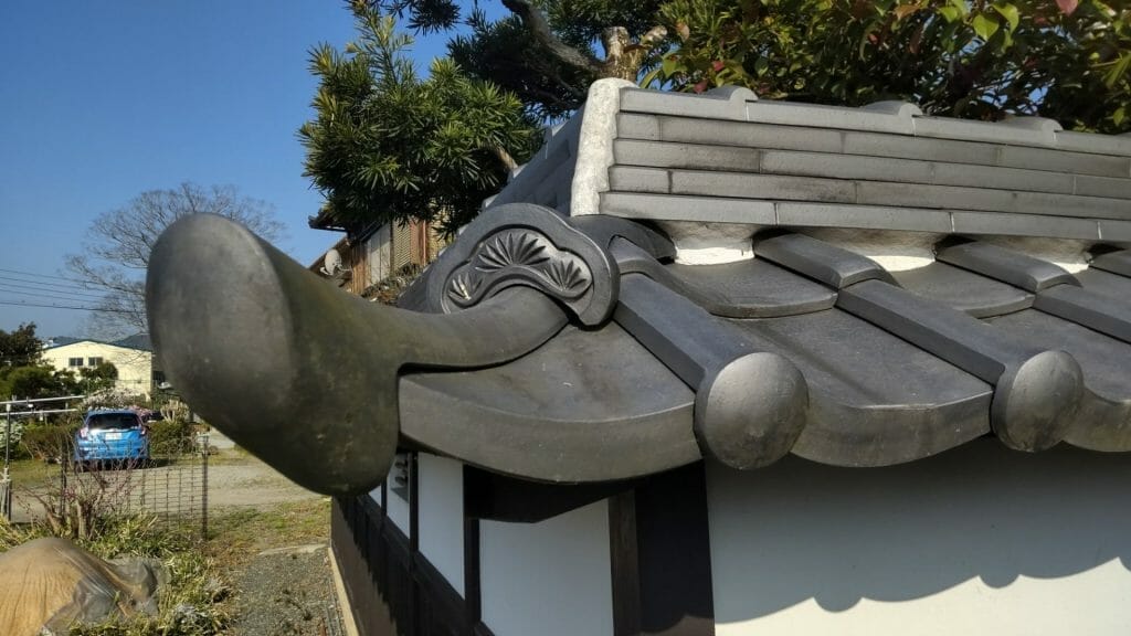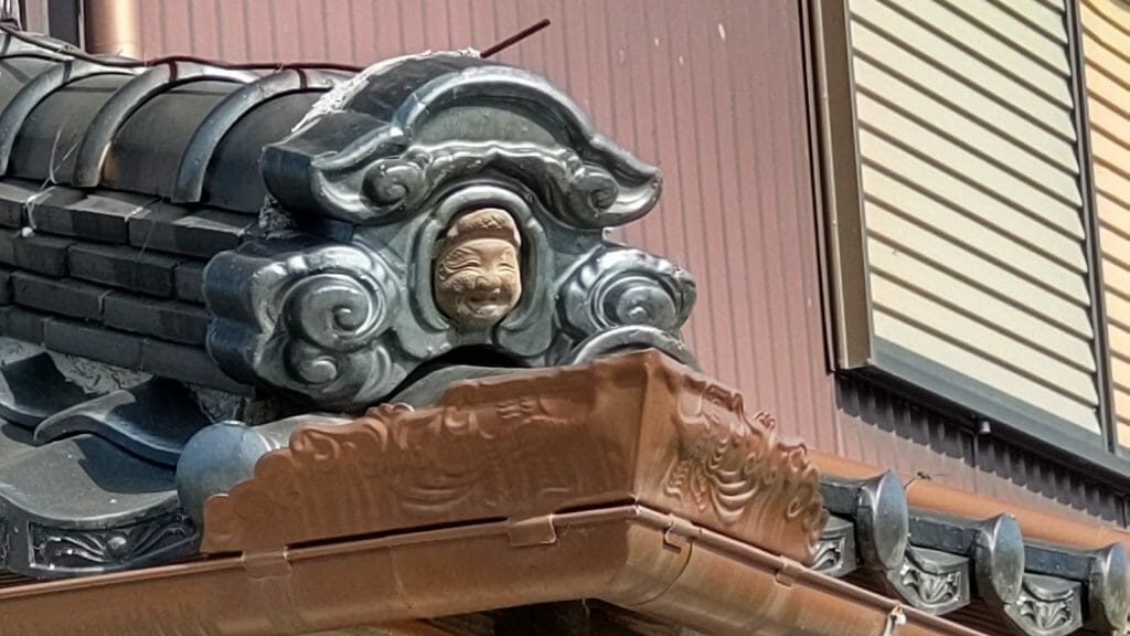 You can find all sorts of things on roofs, as shown in the above photos, which show a Shachi (see information in Wikipedia), a turtle, and even what I assume is the face of Ebisu, the god of success in business, among other things. Most of these have something to do with protecting the house. For example, the mythical Shachi is said to be able to make it rain, i.e., it protects the house from fire. The character for water and wave patterns also provide protection from fire.