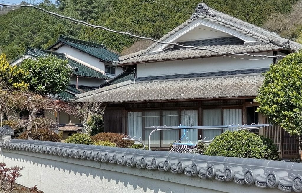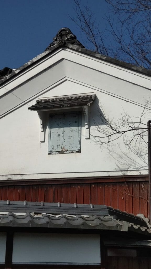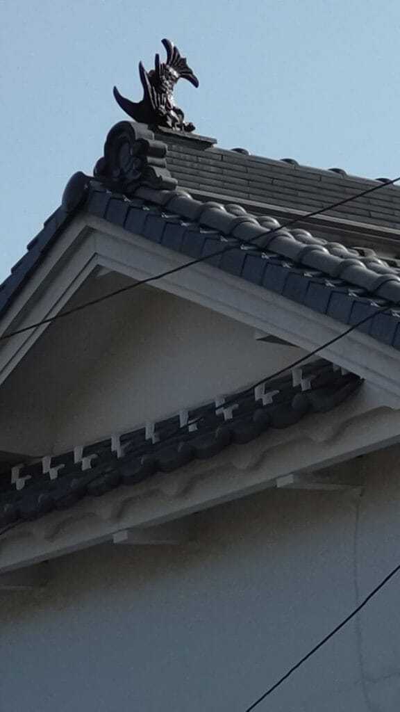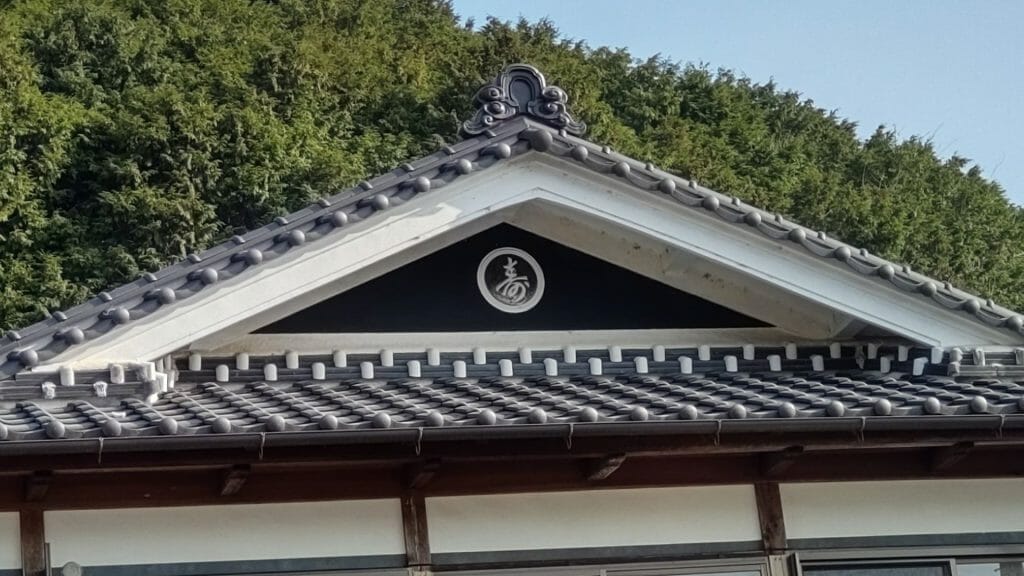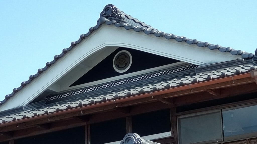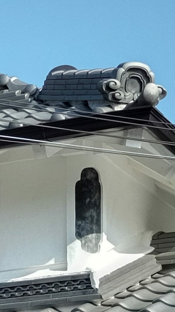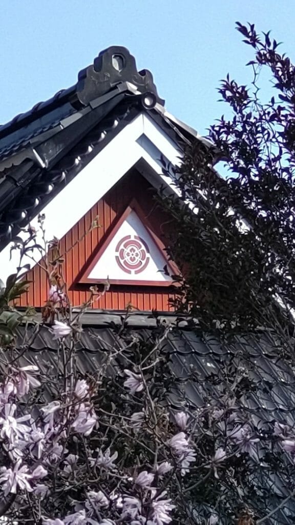 In many areas of Japan you’ll find the family crest, the character for water, or other decorative medallions in the gable of the roof. They are not as common in our area for a reason I’ve not yet been able to discover (possibly a symbol of restraint). There are a few, and above are two houses with the family crest and one house with the character that means congratulations or long life.