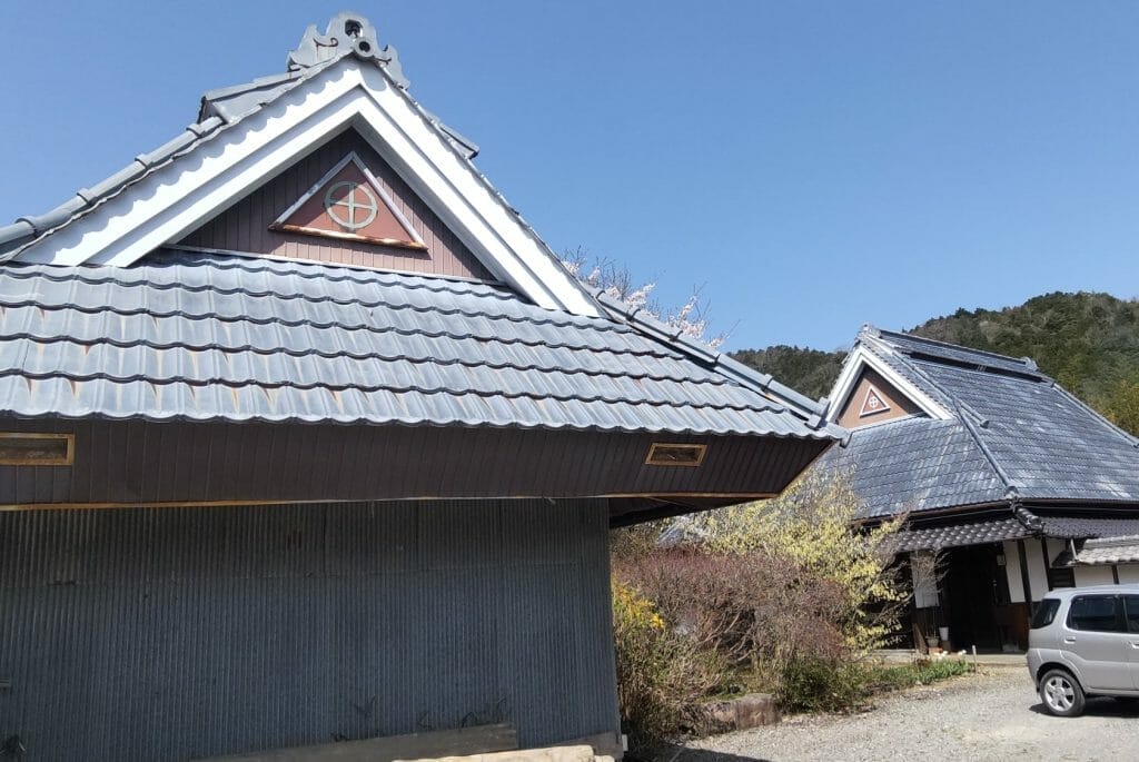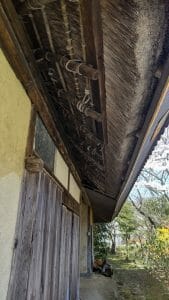 The house next to ours (separated by a couple of fields) is straight out of Japanese history. Hatano Hideharu ruled the area that is now Tamba Sasayama City until Toyotomi Hideyoshi defeated him and went on to unify Japan. There are all sort of legends and theories about the history of that time, but it’s said that Hideharu’s descendants resettle to our valley when he was defeated and died (or was executed). His grave site is in the mountains near the house. We believe our house was related to the Hatano clan in some way because of the proximity and similarity of the houses in structure and age. The front of the two buildings in the above photos is a Nagaya-mon gateway (equipped with rooms, possibly for a gatekeeper) and is estimated to be over 200 years old. You can see the family crest both at the end of the Nagaya-mon and in the gable of the main house. In one of the detail photos you can see the bamboo and thatch structure of the roof.