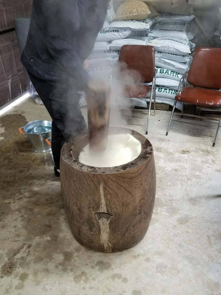 Mochi Tsuki. First, the rice was cooked and then placed into a large type of ‘mortar and pestle’ to pound the rice. This requires two people, one who hammers with a wooden mallet and one who folds in the mochi. This can become a demonstration of coordinated speed and skill as the ‘folder’ jumps in and folds the rice between hammer strokes. For us beginners it was definitely not a demonstration of either! Once the mochi has been pounded it is molded into spherical shapes similar to a snowman. Two of these, one large and one small, are placed on top of a ceremonial stand for the kagami mochi.