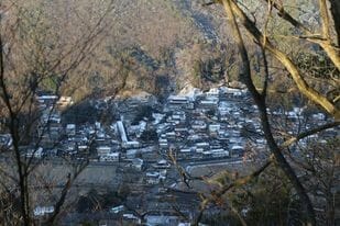 1er janvier 2021 : En descendant, le quartier de Tachikui dans la ville de Tamba Sasayama… on reconnait au centre gauche de l’image, le long bâtiment du noborigama historique.