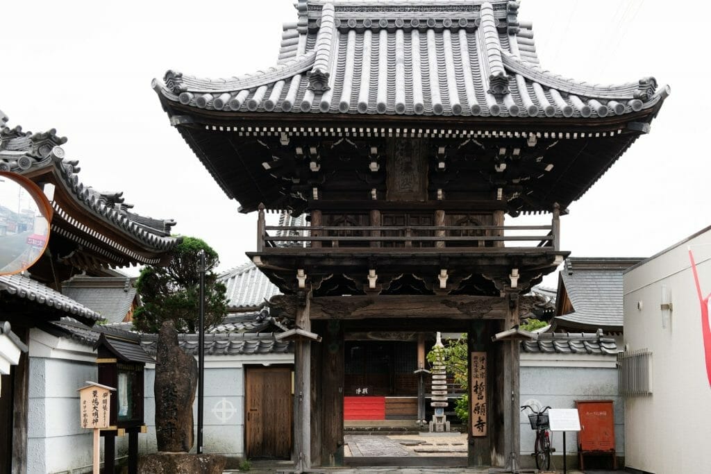 一間一戸の重層屋根入母家造り本瓦葺き四脚門で、釘一本も使わぬ組み合わせ工法が素晴らしい楼門が印象的。