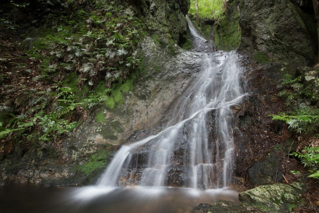 多紀アルプスの水を集めた谷川が、断崖層から多くの滝をつくっている。