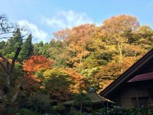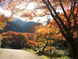 The Shitsukawa area, known as the “Tambasasayama Shangri-La,” is a beautiful satoyama (forested mountain area adjacent to a human community) that resembles something from a Japanese folktale. Among them, the area around Kagobo Onsen (Kajika no Sato, the original source of Mitsuya cider) is particularly known for its stunning autumn leaves.