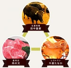 TAJIMA BEEF, which is acclaimed as the pinnacle of Japanese black beef, is produced and fattened at our own ranch, sold at the direct sales store Niku-no-Bun, and served at the directly managed restaurant Gyuya Tanaka.