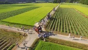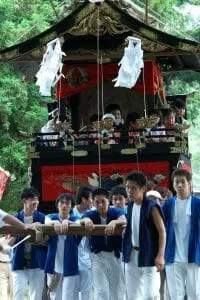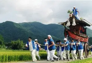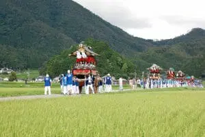 Eight festival floats called “Danjiri” are led from each villages to the shrine and shaken powerfully in the