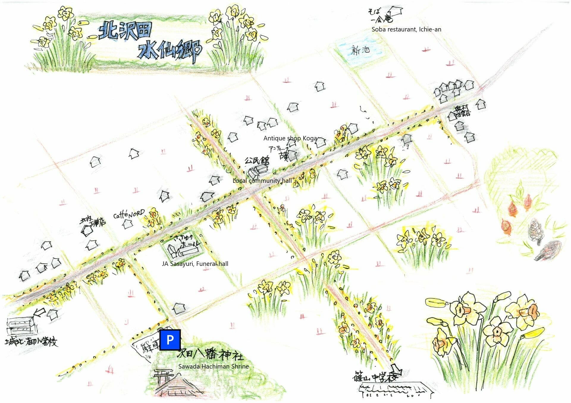 You can park your car in the parking lot near Sawada Hachiman Shrine and walk around. It takes about 20 to 30 minutes to go around. How about taking a nice walk looking at the daffodils?