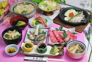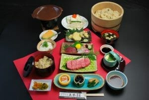 Tamba beef steak (approx. 100g), sashimi , tempura assortment, soba noodles with grated yam, three kings of appetizers, chawan-mushi(savory steamed egg custard with assorted ingredient), seasonal mixed rice, pickles, miso soup, and fruit