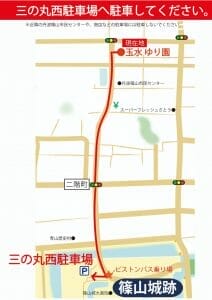When the parking lot is full, please use the Sannomaru Nishi parking (by the Sasayama castle, 10min walk, 200 yen per car). |